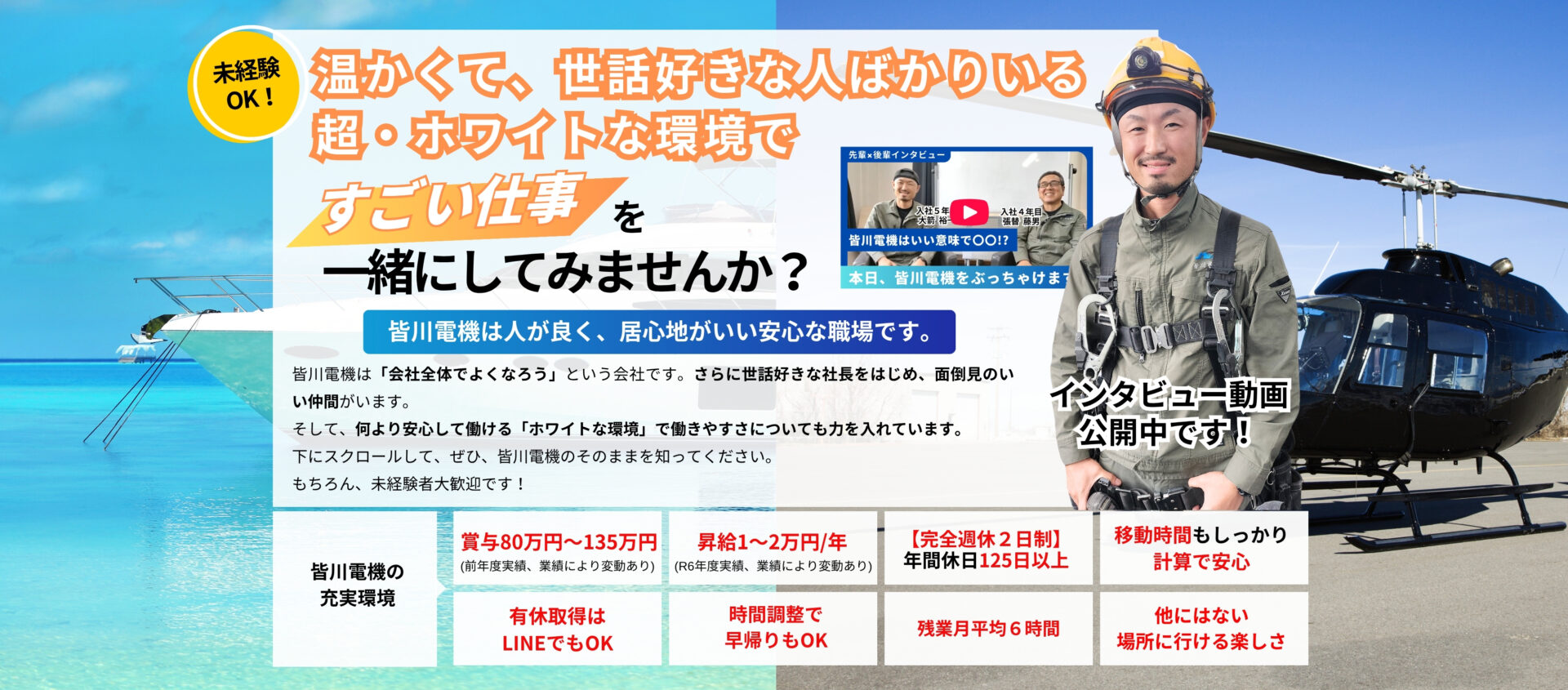 とくに皆川電機が他の一般的な電気工事の会社と違うのは特殊な現場もあり、色んな経験ができるという点です。例えば、ヘリコプターに乗って山の現場にいったり、船に乗って現場に行ったりなど、他の電気関係の会社ではなかなか経験できない特別な仕事ができます(もちろん、この移動時間も給与の対象になります)。